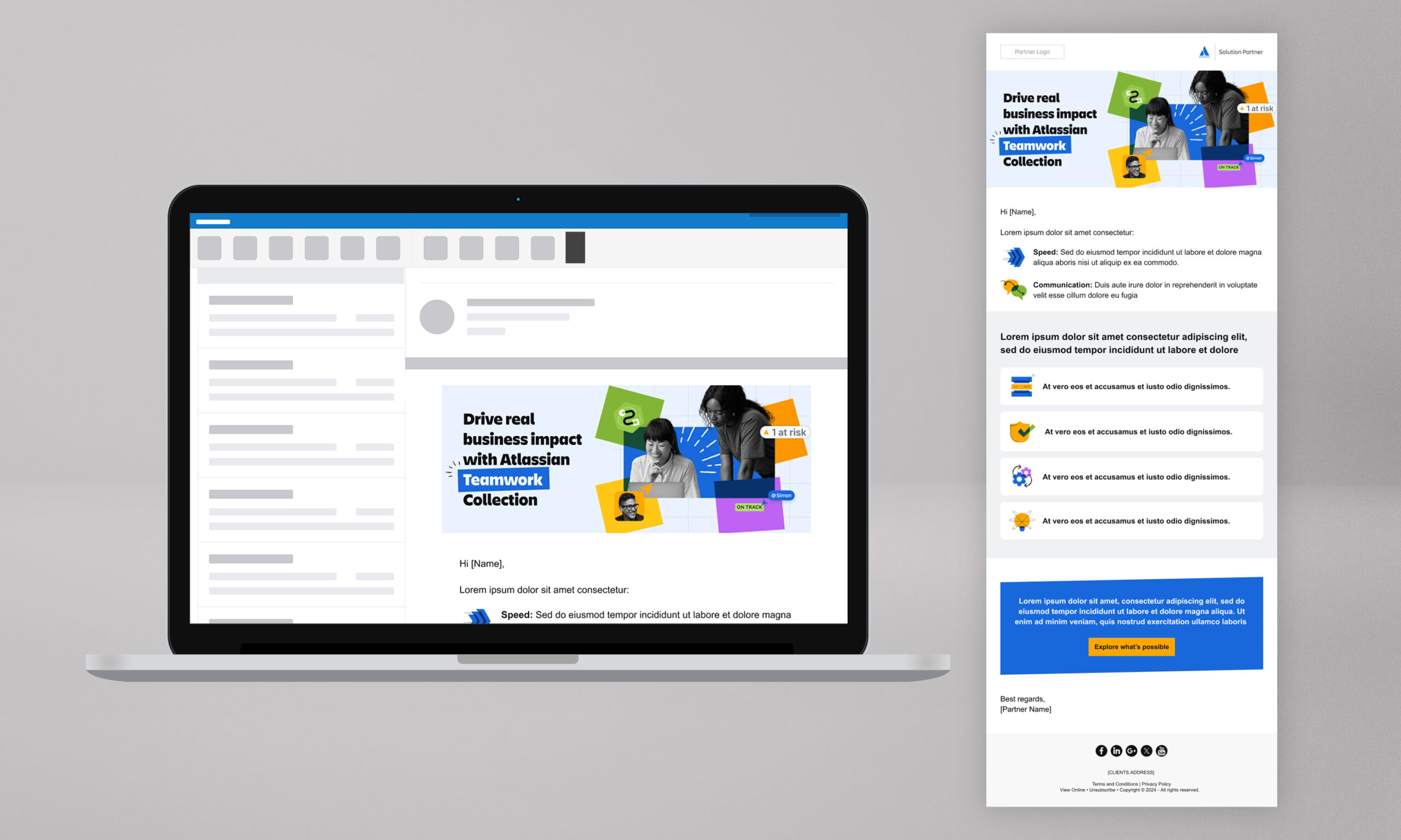 As part of the campaign, a series of marketing emails was designed to align closely with the landing page and broader Atlassian brand system. The emails follow Atlassian’s visual identity, incorporating humanistic shapes, playful layouts, and bold colour usage, alongside black-and-white collage-style imagery to maintain consistency across touchpoints.