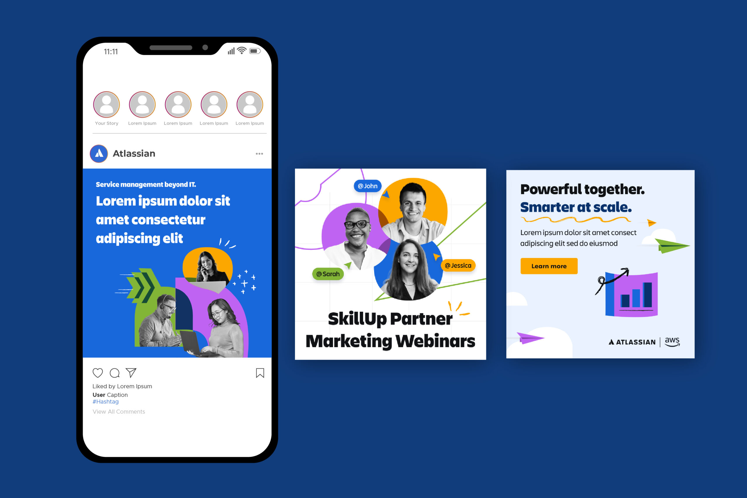 A range of digital ad banners and social media tiles was designed to demonstrate how Atlassian’s visual identity adapts across multiple platforms and formats, including Facebook, LinkedIn, and Instagram. Each asset was carefully scaled and reformatted to suit different aspect ratios and placements, ensuring clarity, legibility, and visual impact regardless of size.