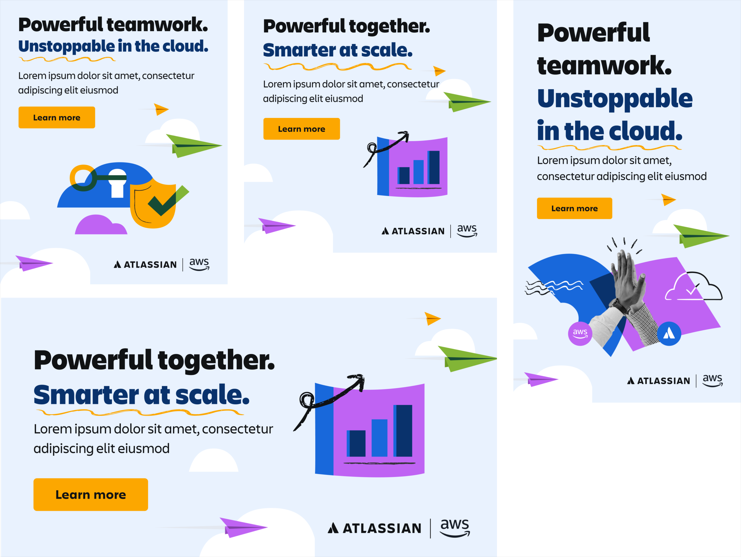 A set of digital ad banners was designed to support the campaign across paid and partner channels, driving traffic to the landing page and reinforcing the overall campaign message. The banners follow Atlassian’s visual identity and brand guidelines, carrying through the same layouts, colour usage, and playful graphic elements to ensure consistency and strong brand recognition at smaller scales.